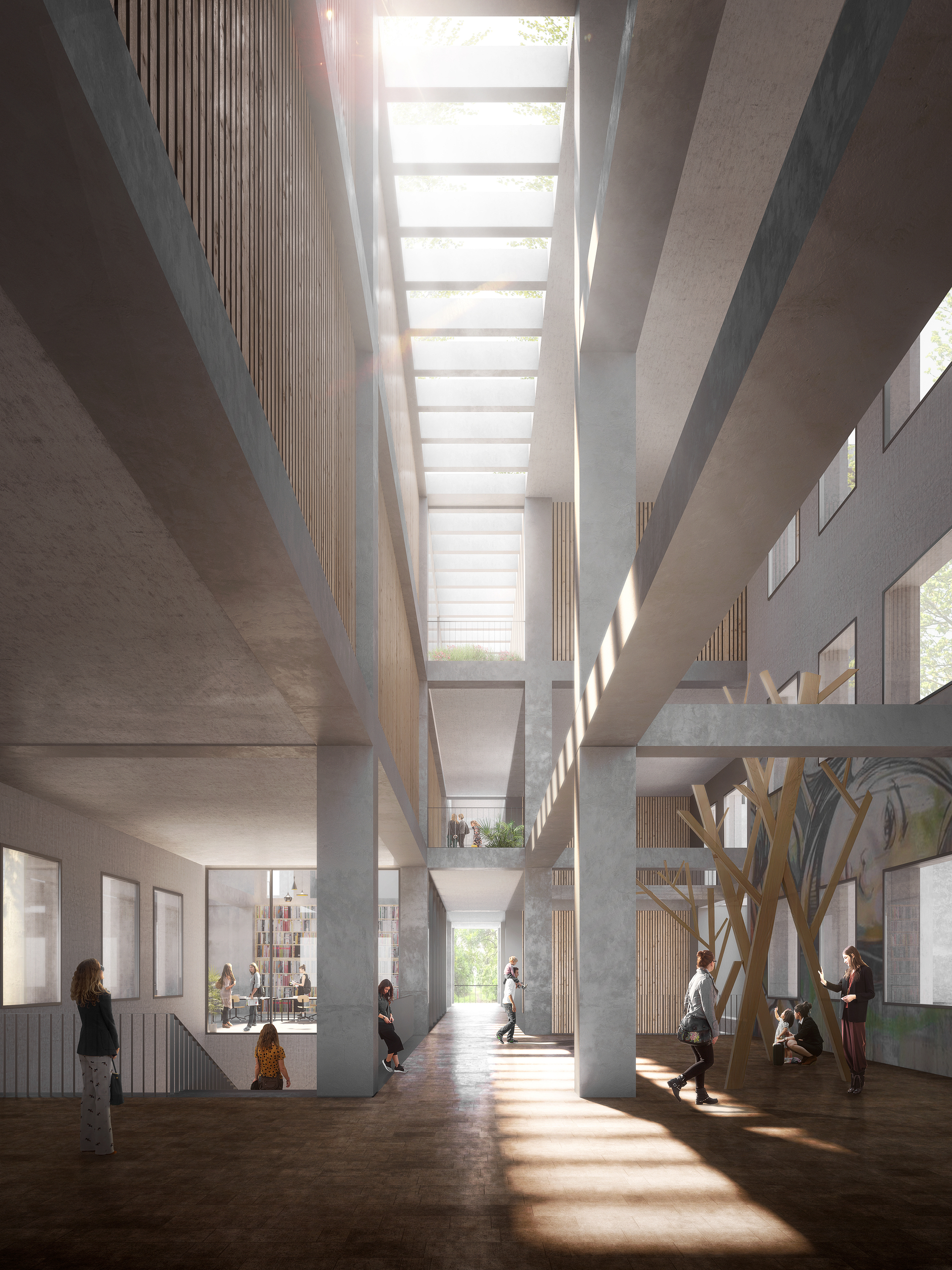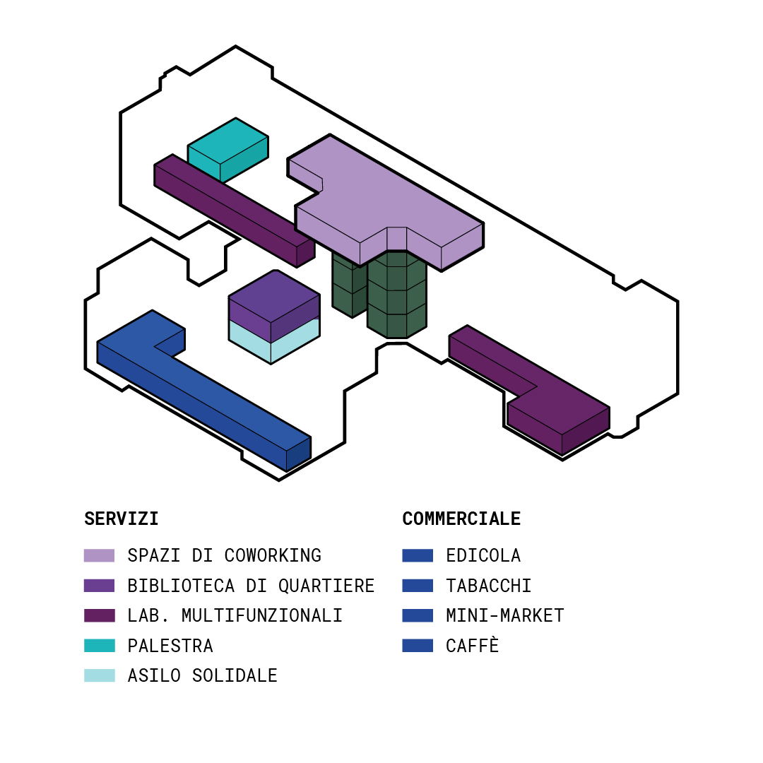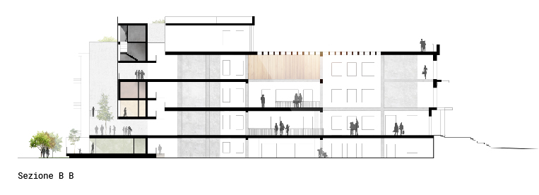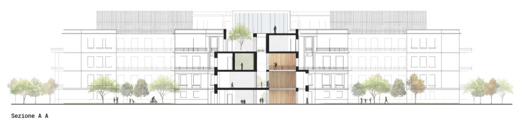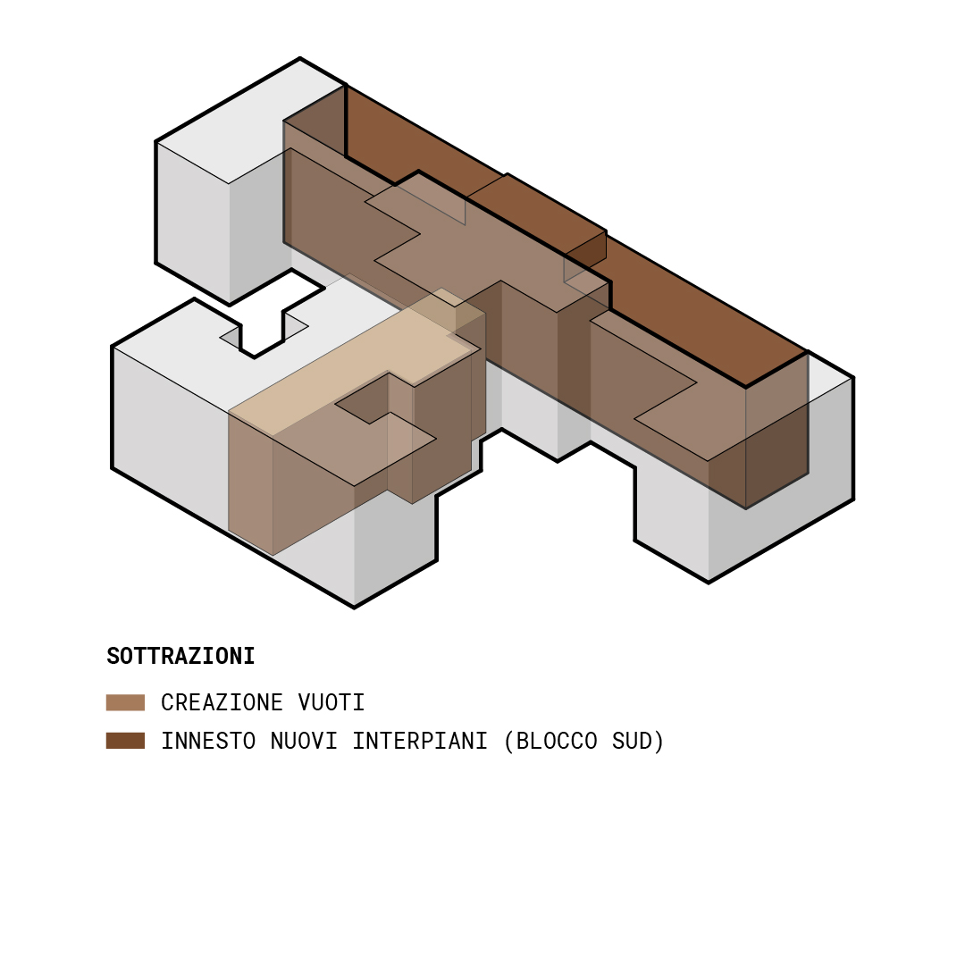 La struttura del fabbricato a nord e quella centrale saranno ripristinate attraverso consolidamenti dei solai e dei pilastri con rinforzi strutturali in materiali compositi, siano essi in fibra di carbonio o fibra di vetro, poiché rappresentano la soluzione con il miglior rapporto qualità/prezzo per interventi di adeguamento sismico in quanto risultano interventi non invasivi, leggeri e rapidamente eseguibili. Al ripristino seguirà una fase di svuotamento puntuale con l’obiettivo di creare doppie altezze e cortili interni che ospitino i servizi alle residenze e le attività collettive.
