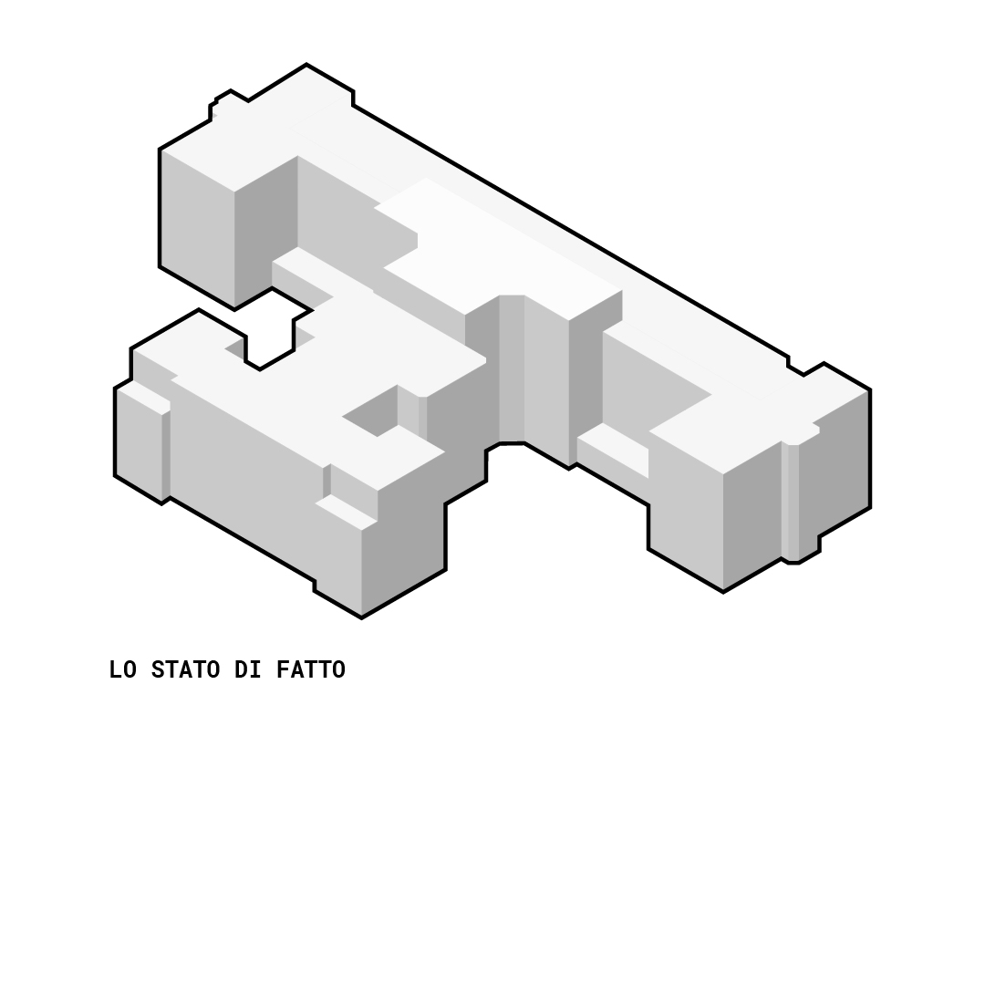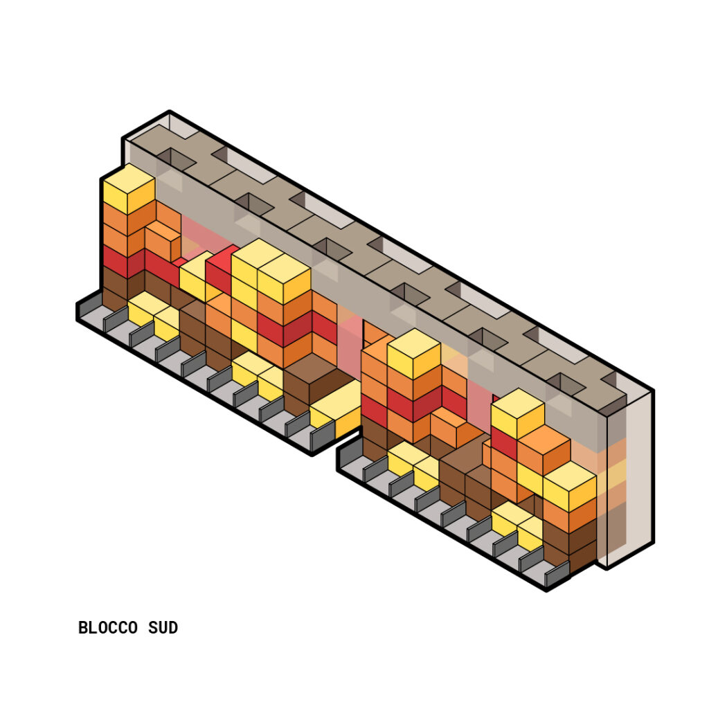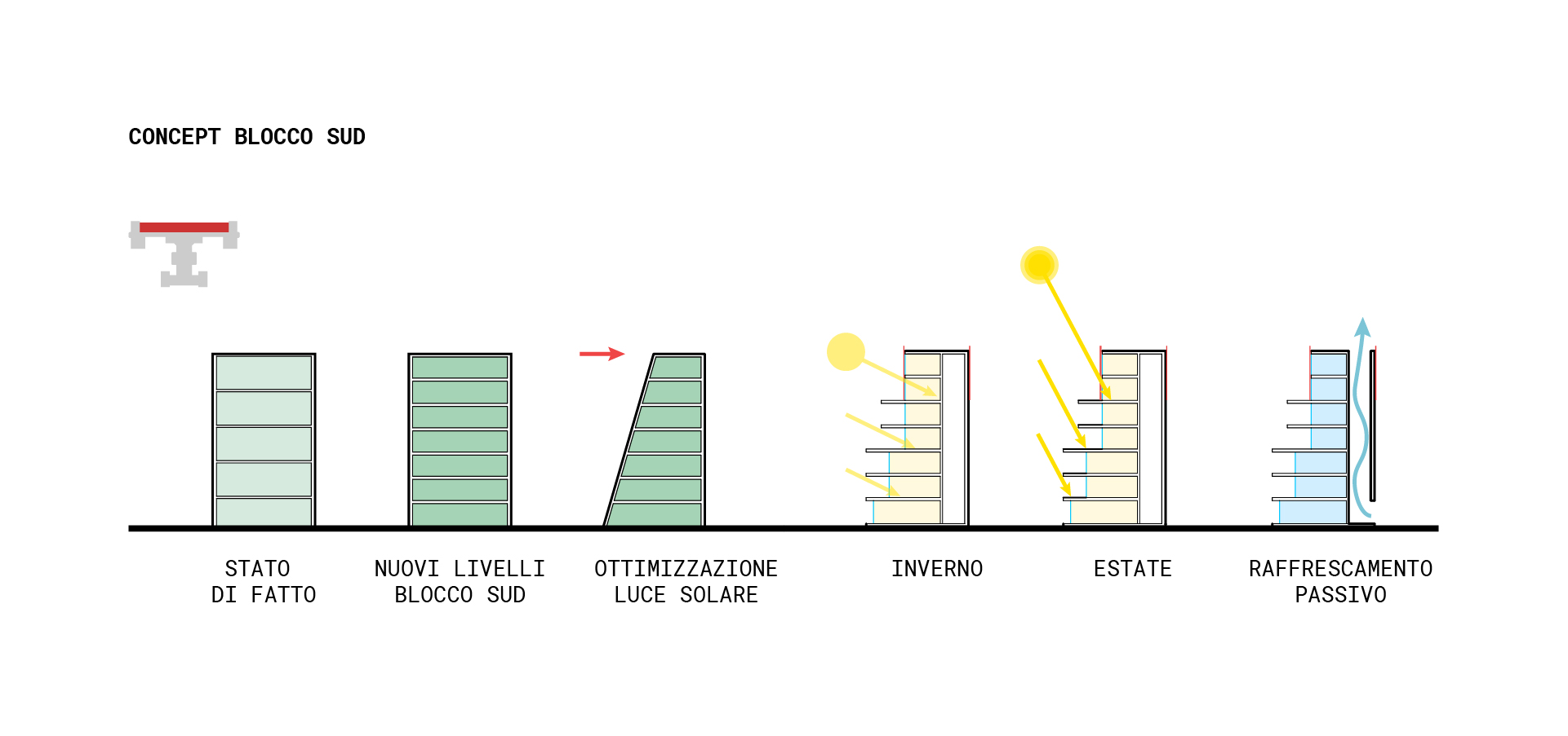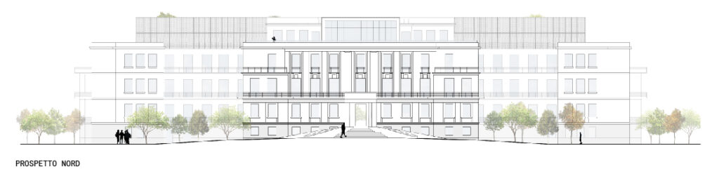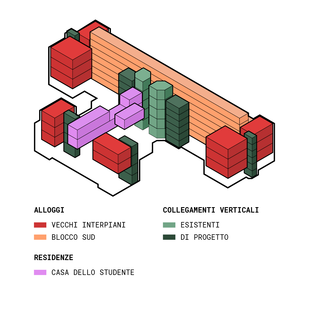 In particolare, si può dividere il complesso in due parti quella a sud meglio esposta alla luce e alla ventilazione naturale, si presenta autonomamente ad ospitare le residenze e quella a nord compreso il braccio di collegamento centrale da adibire maggiormente ad attività di servizio alle residenze e attività collettive. La configurazione attuale del braccio a sud però presenta interpiani eccessivi pertanto l’ipotesi progettuale di incrementare le residenze ha portato a ripensare interamente la struttura a sud, ipotizzando di demolire l’attuale orditura di travi e pilastri e con essa anche la facciata, la quale non presenta particolarità architettoniche di rilievo ma piuttosto è stata suscettibile di superfetazioni nel corso del tempo, per poi innestare alla porzione di fabbricato esistente una nuova struttura in travi e pilastri di calcestruzzo armato con un interpiano di 2,70 mt il che consente di ottenere due piani in più di residenze nel rispetto delle prescrizioni vigenti in materia di edilizia abitativa.