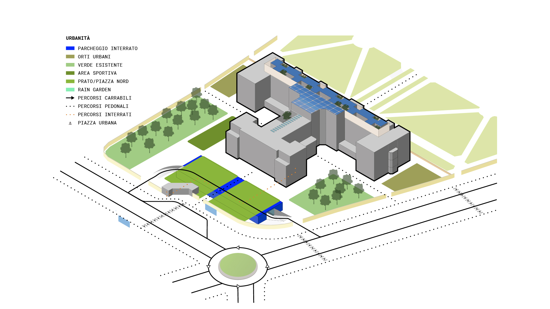 La struttura del sanatorio tubercolare Ex-Galateo, si configura come uno spazio ben integrato nel tessuto urbano esistente, disposto in posizione decentrata rispetto al centro della città ma ben collegato ad essa. L’area si presenta recintata e intatta nella sua memoria storica e la struttura seppure ammalorata rende riconoscibili gli usi per cui è stata progettata. In base a queste premesse, per rispondere alla volontà dell’Ente banditore di destinare gli spazi oggetto di concorso alla funzione residenziale e sociale e per cercare quanto più possibile di preservare gli elementi strutturali esistenti, l’idea progettuale intende offrire a Lecce uno spazio in cui la componente residenziale sia varia e predominante e la componente sociale si inserisca all’interno della struttura creando un collegamento con la parte esterna, per diventare polo attrattore. Un luogo accessibile, sicuro con spazi di aggregazione pubblici e privati con funzioni di cui la città può appropriarsi senza subirne la presenza.